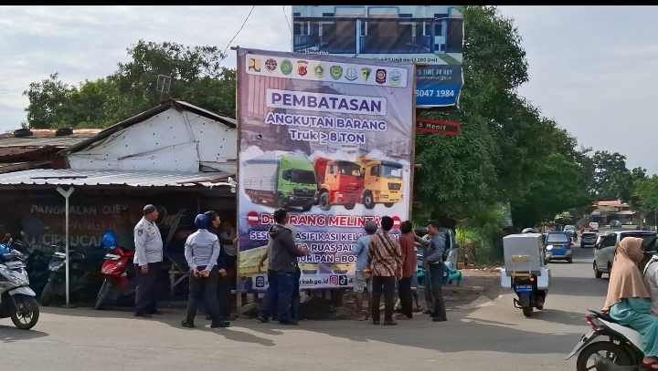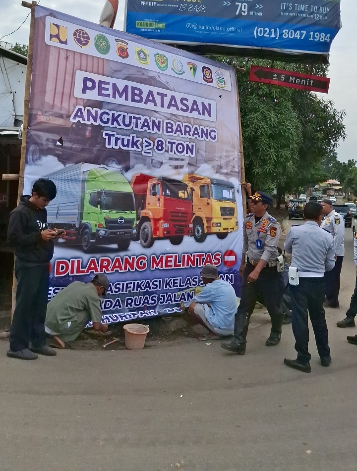 Dishub Kabupaten Bogor Pasang Banner Pembatasan Angkutan Truk Berat di Pertigaan Cipeucang
