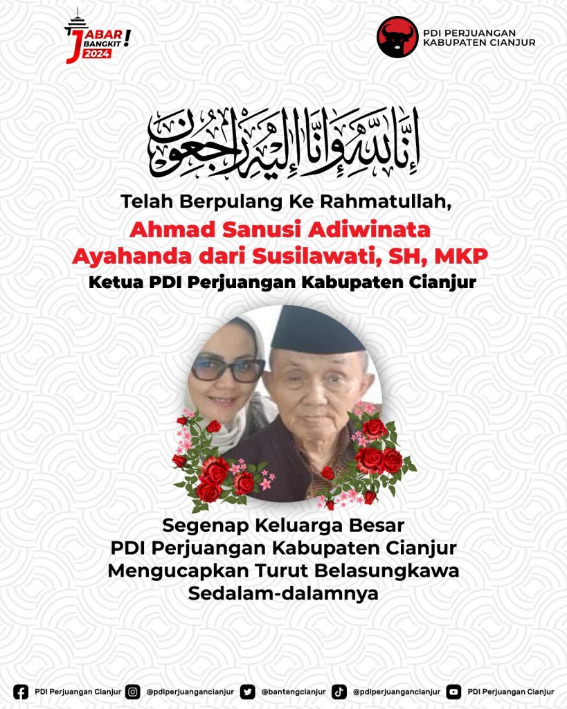 CIANJUR – Innalillahi wainna ilaihi rojiun.. Ketua DPC PDI-PERJUANGAN  kabupaten Cianjur Susilawati SH.MKP menyampaikan kabar duka cita atas berpulangnya ke Rahmatullah, sang ayahanda tercinta   H.Ahmad Sanusi. Almarhum dimakamkan di makam keluarga yangg terletak di desa Sukakerta kec  Cianju