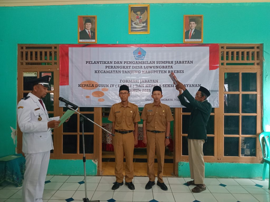 BREBES – Pemerintah Desa Luwungbata Kecamatan Tanjung Kabupaten Brebes menggelar Acara Pelantikan Perangkat Desa Kadus 4 dan Kasi Pelayanan di Aula Desa Luwungbata, pada hari Kamis,10/04/2025.Kegiatan Pelantikan ini juga dihadiri oleh Plt.Camat Tanjung Nanang Raharjo SE.MH, Polsek dan Danramil,BPD,LPM,PKK,Tokoh Agama,Tokoh Masyarakat,Tokoh Pemuda serta Masyarakat Desa Luwungbata yang ikut menyaksikan Pengambilan Sumpah Jabatan Perangkat Desa ini.Juga Aparat Polri-TNI serta Satpol PP Serta Hansip yang ikut pengamanan Kegiatan ini.