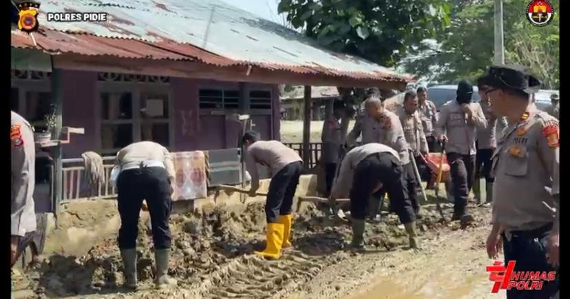 Di lokasi, alat berat tampak bekerja mengangkat material lumpur sisa banjir dan memindahkannya ke dump truck, sementara personel Polres Pidie bersama masyarakat melakukan pembersihan secara manual menggunakan peralatan sederhana. Upaya ini dilakukan guna menormalkan kembali akses jalan yang sebelumnya sulit dilalui akibat endapan lumpur tebal.