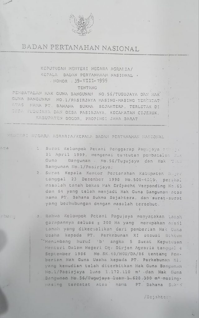 Menurut Brian, dalam Keputusannya Menteri ATR/BPN menyatakan, mencabut SK Kepala Kantor Wilayah BPN Jawa Barat, Tgl 9 Okt 1997 No.874/HGB/KWBPN/1997 dan SK Kakanwil BPN Wilyah Jabar No. 876/HGB/KWBPN/1997, Tgl 9 Okt 1997 ttg Pemberian HGB kepada PT. BSS.