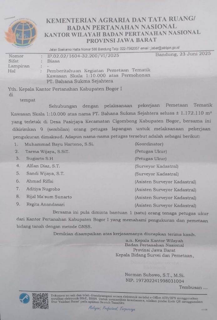 Surat tertanggal 23 Juni 2025 bernomor IP.02.02/1604-32.200/VI/2025, tersebut ditanda tangani Kepala Bidang Survei dan Pemetaan atas nama Kepala Kantor Wilayah BPN Provinsi Jawa Barat, untuk pengukuruan tanah BSS seluas 1.172.100 meter persegi terletak di Desa Pasir Jaya.