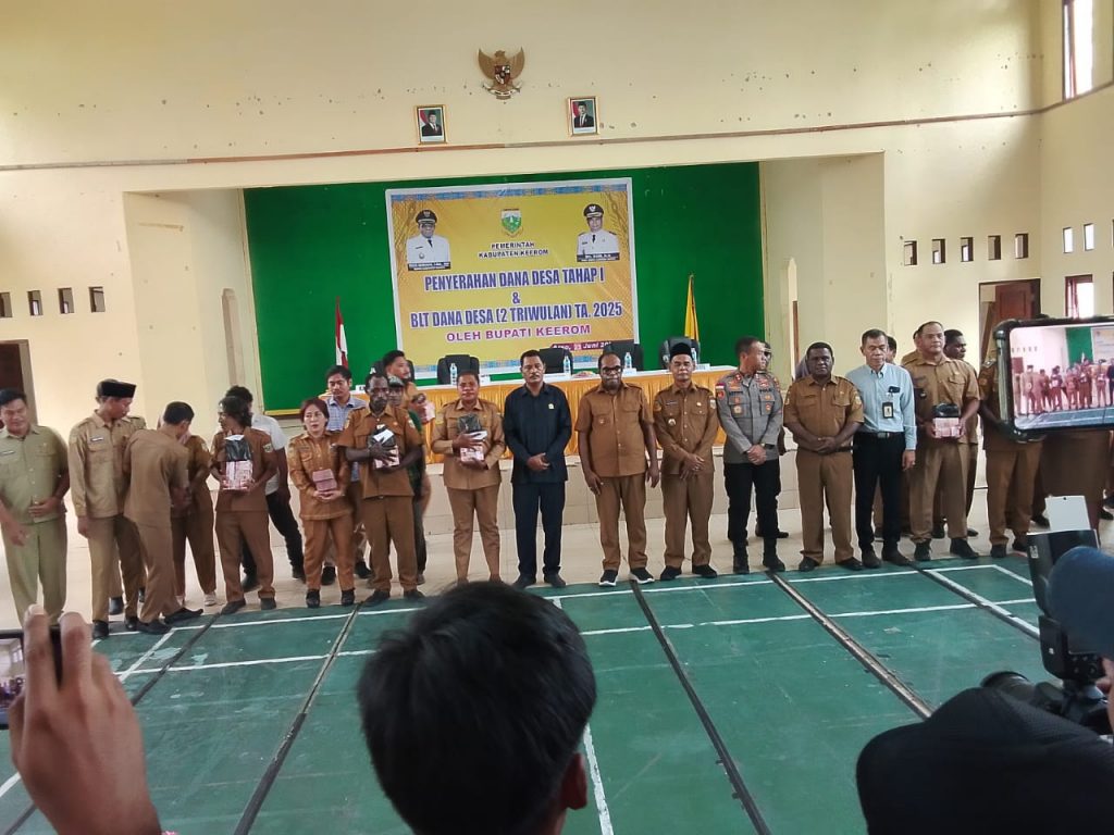 KEEROM – Penyaluran Dana Desa (DD) Tahap I dan BLT Dana Desa (2 Triwulan) Tahun Anggaran 2025 di Kabupaten Keerom Propinsi Papua menunjukkan perkembangan positif dengan berbagai upaya untuk meningkatkan tata kelola yang professional dan transparan. Penyerahan Dana desa dipimpin langsung Bupati Keerom Piter Gusbager, S.Hut, MUP Bertempat di gedung Pramuka distrik Arso asiaman. Senin (23/6).