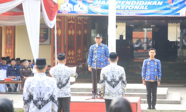 LAMPUNG BARAT – Bupati Lampung Barat Parosil Mabsus memberi teguran keras dan sangsi terhadap lima Kepala Sekolah yang indisipliner pada saat upacara perayaan Hari Pendidikan Nasional (Hardiknas) ke-66 yang berlangsung di halaman depan Kantor Bupati setempat, Senin 05 Mei 2025.