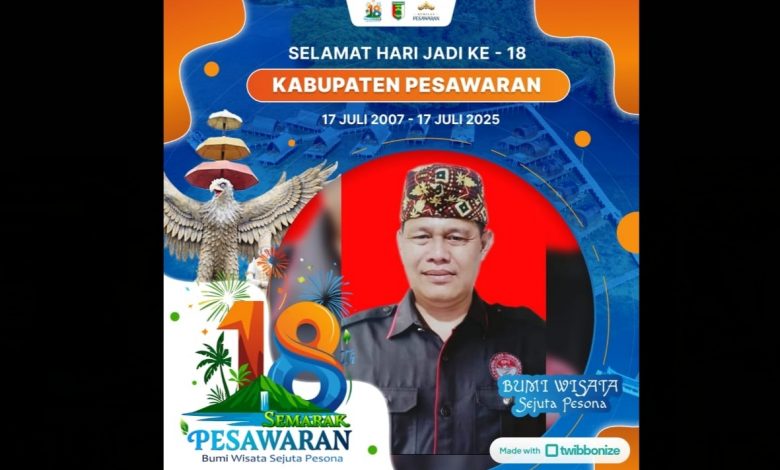 PESAWARAN — Memperingati Hari Ulang Tahun (HUT) ke-18 Kabupaten Pesawaran, Ketua Setwil Forum Pers Independent Indonesia (FPII) Provinsi Lampung, Supiyawan, menyampaikan ucapan selamat sekaligus ajakan untuk memperkuat kolaborasi dalam membangun daerah.