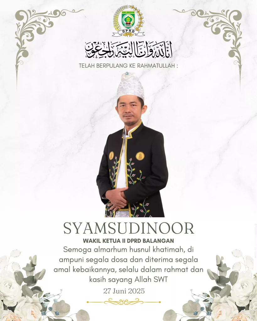 BALANGAN – Kabar duka datang dari DPRD Kabupaten Balangan. Wakil Ketua DPRD Balangan periode 2024–2029, Syamsudinoor, wafat pada 1 Muharam 1447 H atau bertepatan dengan Jumat (27/6).
