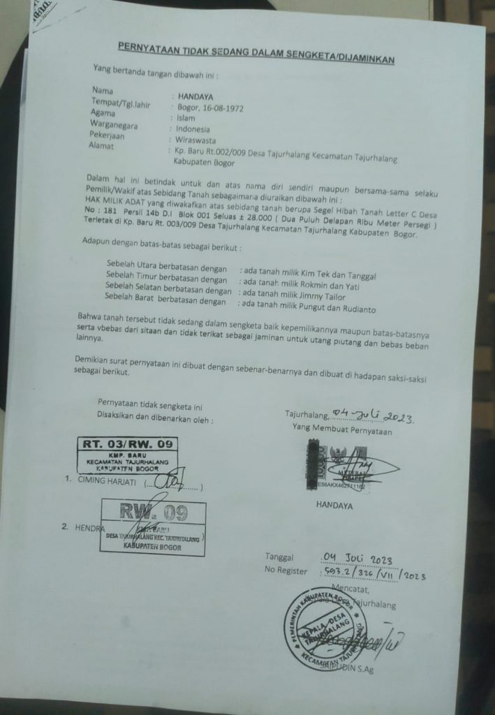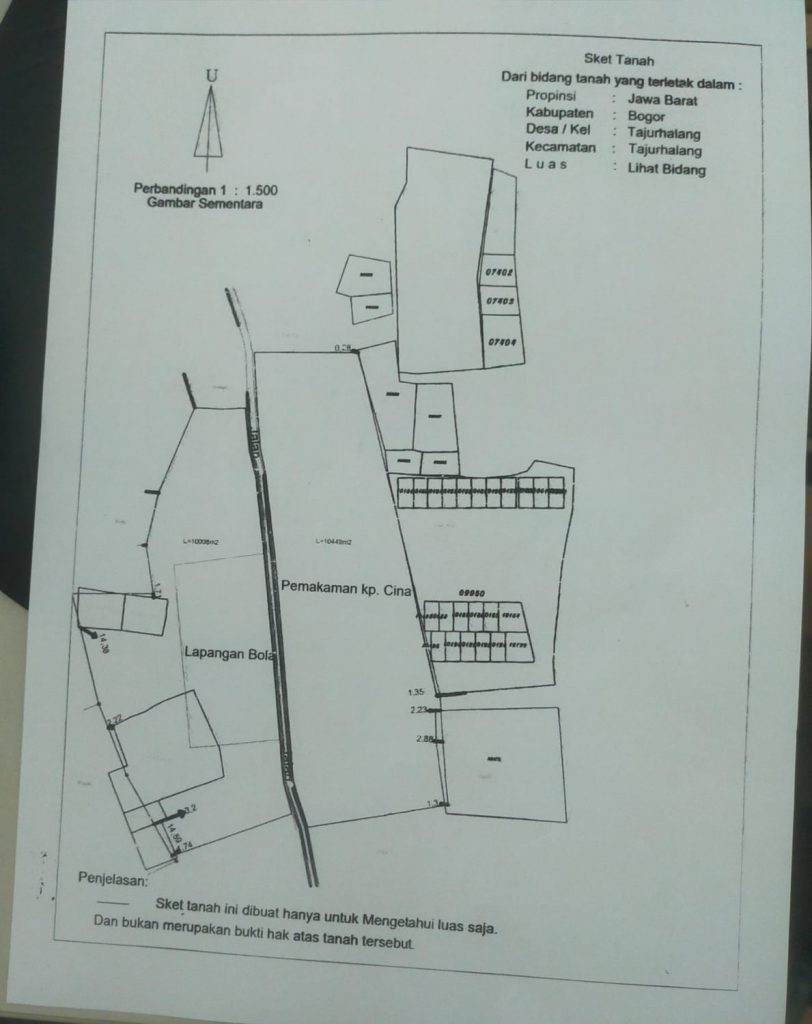 “Tanah tersebut berupa Tanah Darat Persil P.14, DI C.565, Kelas DI, Desa Tajurhalang, (sekarang Desa Tajurhalang-red), Kecamatan Bojonggede (sekarang Kecamatan Tajurhalang-red), Kabupaten Bogor,” imbuh Handaya.