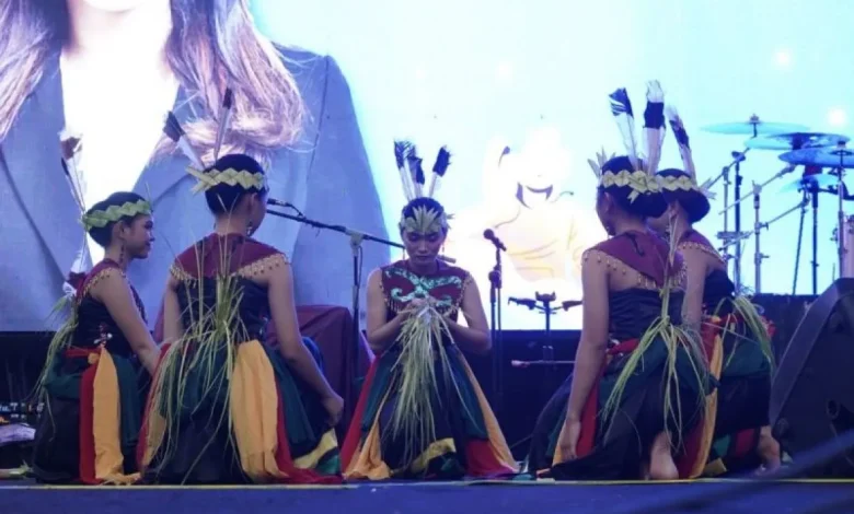 Tim penari yang terdiri dari lima remaja putri, tampil dengan balutan nuansa tradisional adat Dayak seakan bercerita melalui setiap gerakan tubuh dan ekspresi wajah mendalam, sukses menghibur pengunjung KIMFest 2025.(AKHMAD SIDIK)
